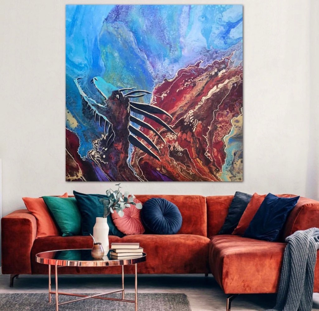 I wanted to do an acrylic flow painting on this large 4’ x4’ with some red. I tend to gravitate towards gold and blue and wanted to be bolder.